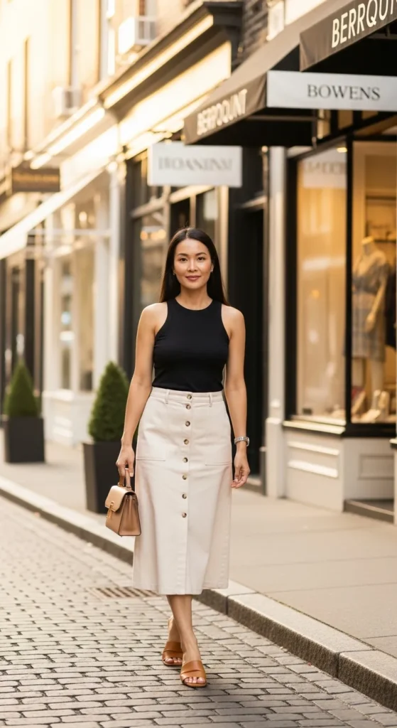 A button-front midi skirt combined with a fitted tank top offers an effortlessly feminine summer silhouette. It feels put-together without being overly styled, perfect for coffee dates or casual afternoons out.
