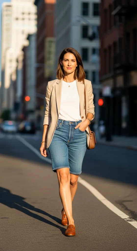 A lightweight blazer worn over a simple tee and denim shorts creates a perfect balance between casual and polished. It’s the kind of outfit that feels confident and relaxed while still looking intentionally styled.