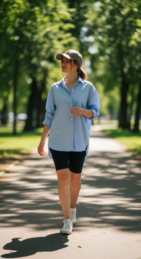 An oversized cotton shirt paired with sleek bike shorts offers an easy modern outfit for busy summer days. It feels sporty, relaxed, and effortlessly stylish without needing many layers or accessories.