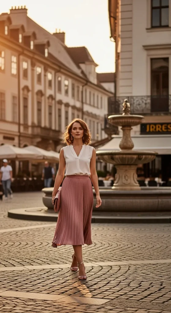 A pleated midi skirt combined with a sleeveless blouse creates a graceful summer outfit that feels both comfortable and elegant. The movement of the pleats adds visual interest without needing bold prints.