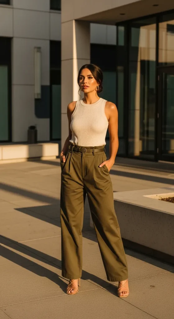 A fitted ribbed tank paired with flowy high-waisted wide-leg pants feels effortlessly modern. The contrast between the structured top and breezy pants creates a flattering silhouette that feels relaxed but still intentionally styled for everyday summer plans.