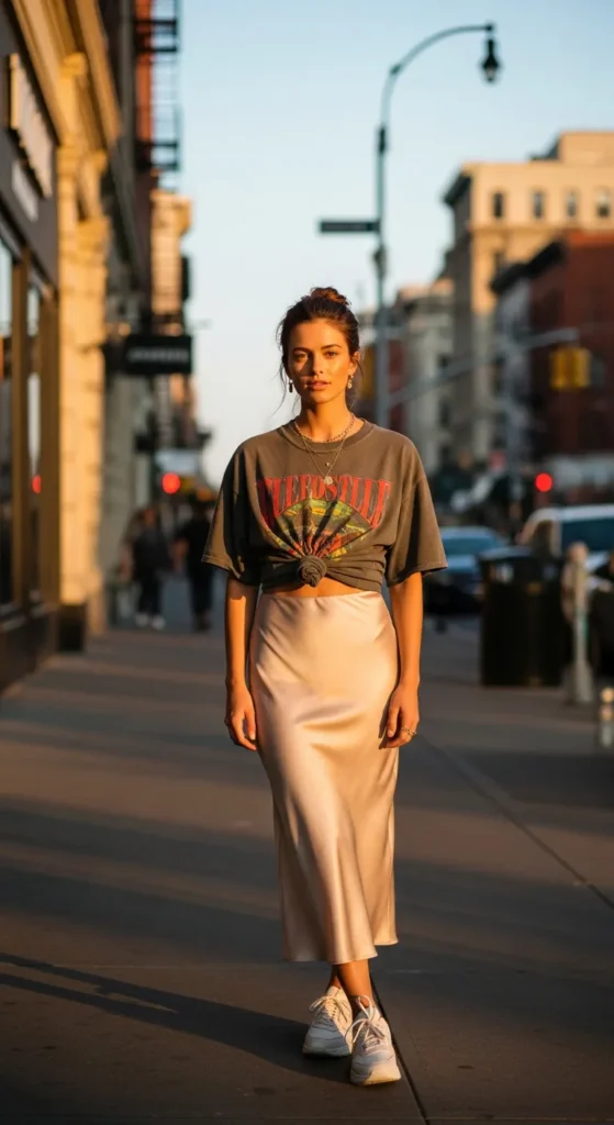 A silky slip skirt paired with an oversized graphic tee creates a relaxed yet fashion-forward outfit. The mix of casual and elegant textures gives the look personality while keeping it comfortable for warm summer days.