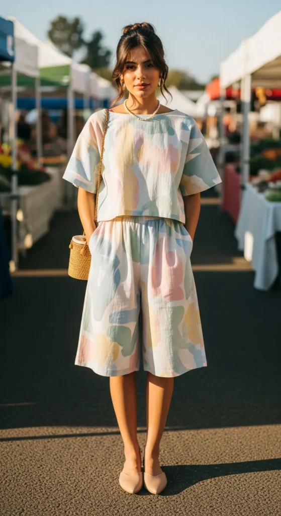 Matching sets are having a real moment, but skip the bold neons and reach for a soft floral or abstract pastel print instead. A loose short-sleeve top with matching wide shorts reads put-together even when you are literally just running errands.