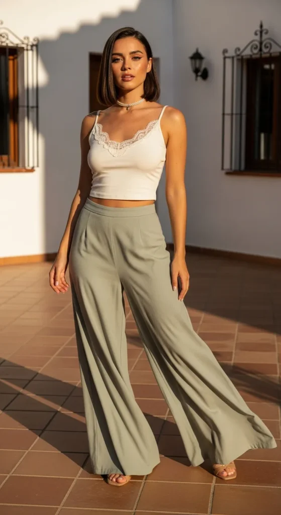 Palazzo pants in a solid muted tone paired with a lace-trim tank feels romantic and summery without being overdressed. The lace detail adds a soft femininity that elevates the look from basic to something you would actually see on a mood board.