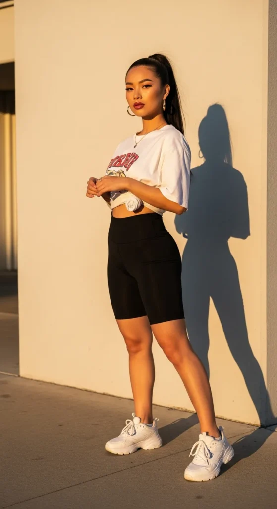 6. Petite Pick: High-Waist Biker Shorts with an Oversized Graphic Tee Knotted at the Hip