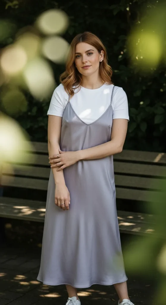 Layering a slip dress over a basic white tee is one of those tricks that looks like you tried without actually trying. The tee grounds the satin and makes it daytime-appropriate, while the slip adds a coolness and ease that a regular dress does not quite achieve.