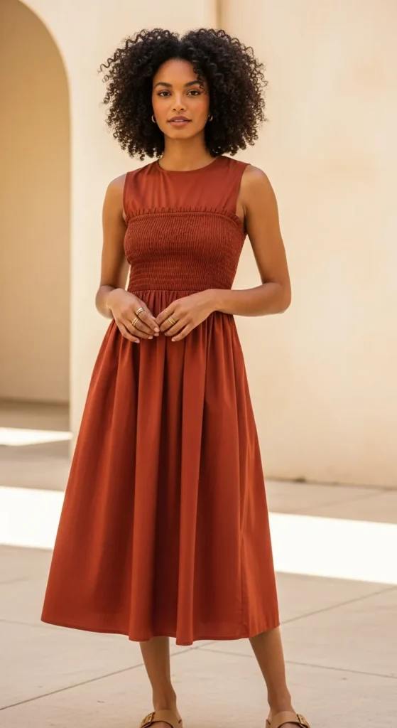 Smocking is your best friend in summer, it stretches, it breathes, and it requires absolutely no styling effort. An earthy terracotta, warm sand, or dusty clay tone against summer skin looks rich and warm without needing anything else.