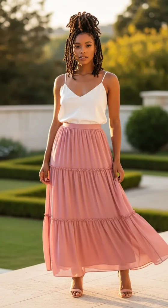 The ruffle maxi skirt does all the heavy lifting here. Keep the top as simple as possible, a fitted cami in white, black, or a tone pulled from the skirt, and let the movement and volume of the tiers be the entire outfit story.