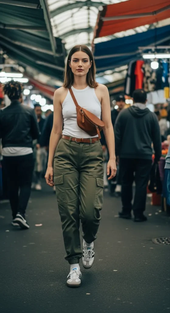 Neutral cargo pants paired with a fitted white tank create a utilitarian-chic outfit. Sambas complete the look with understated retro flair, perfect for a casual day of errands.