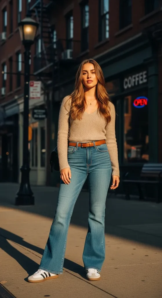 Flared jeans paired with a lightweight knit top create a relaxed yet chic silhouette. Sambas balance retro vibes with modern comfort, ideal for everyday adventures.