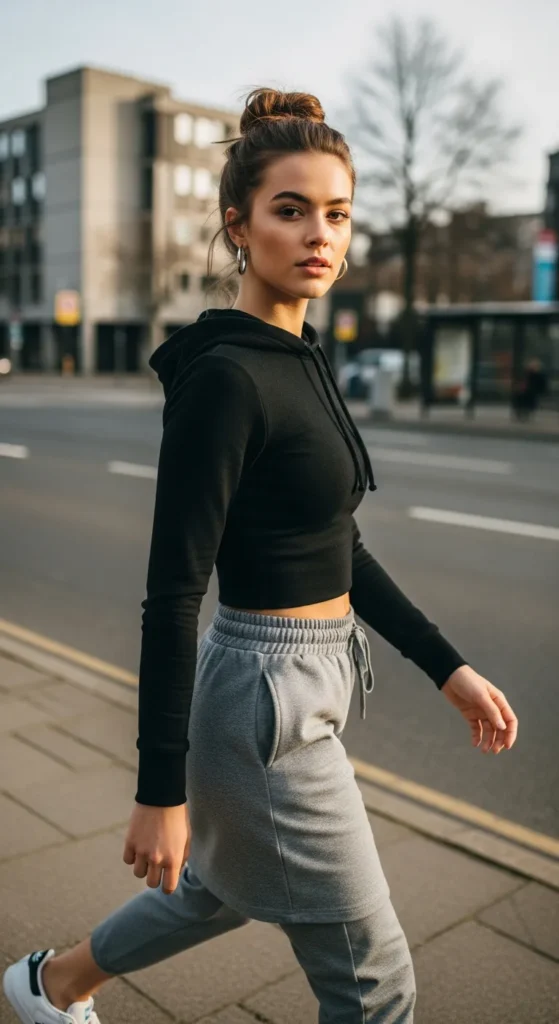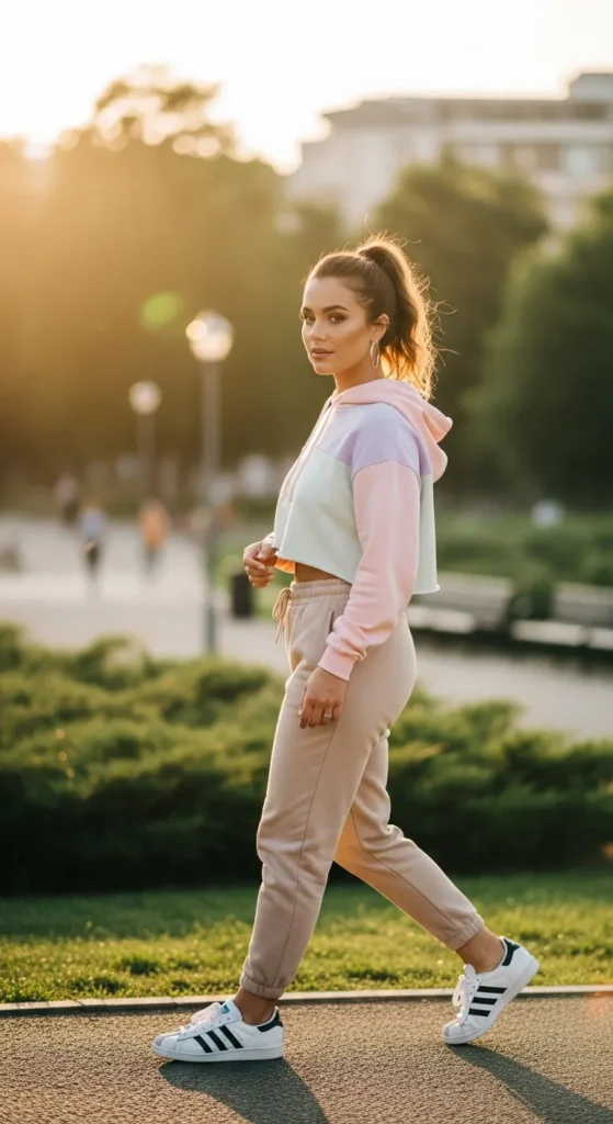 Match neutral-toned joggers with a cropped hoodie for a sleek sporty outfit. Adidas Sambas add a retro charm, balancing comfort with style for running errands or casual meetups.