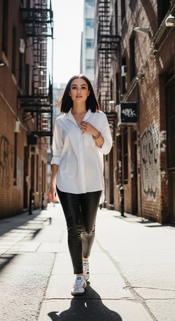 Pair black leather leggings with an oversized white button-up shirt for a mix of edgy and relaxed style. Sambas add a sporty touch that prevents the outfit from feeling too heavy.