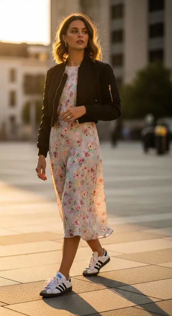 Layer a soft floral midi dress with a cropped bomber jacket for a balance of feminine and sporty energy. Adidas Sambas give the outfit a grounded, modern twist.