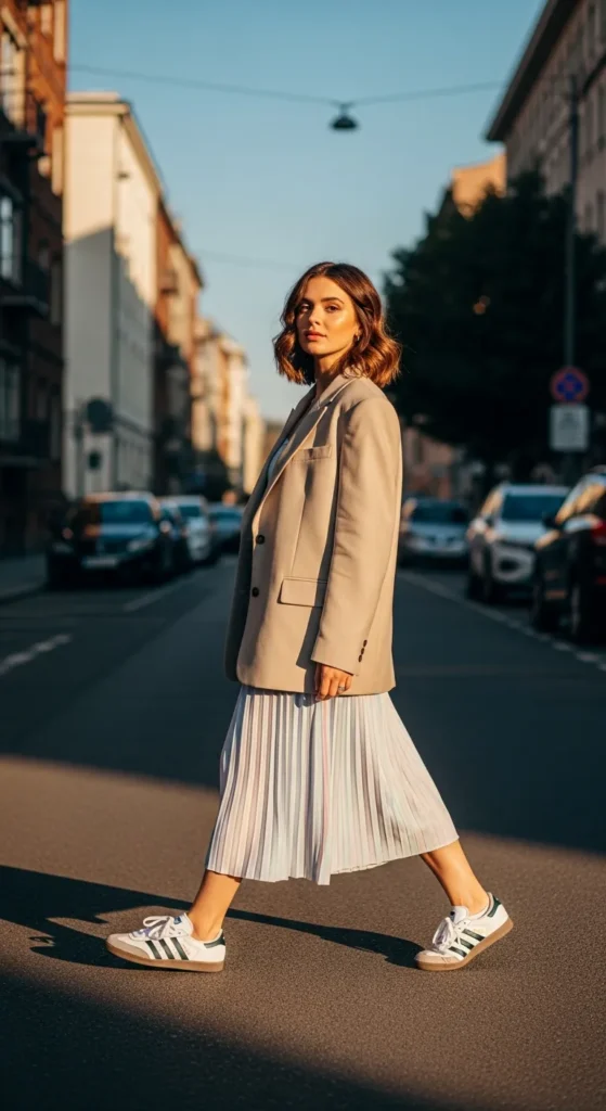 A flowy pleated skirt with an oversized blazer adds structure to an airy outfit. Adidas Sambas soften the formal edges, creating an effortlessly stylish vibe.