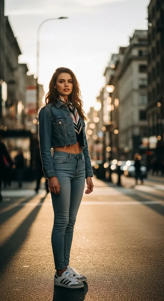 A classic double-denim outfit with skinny jeans and a cropped denim jacket feels timeless yet fresh. Sambas keep it grounded and effortlessly stylish for everyday wear.