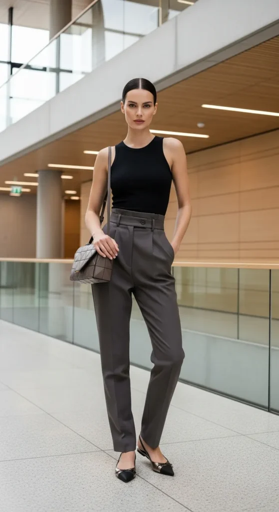 A fitted black tank paired with high-waisted tailored trousers creates a sleek, refined look. The simplicity of the top lets the structure of the trousers take center stage effortlessly.
