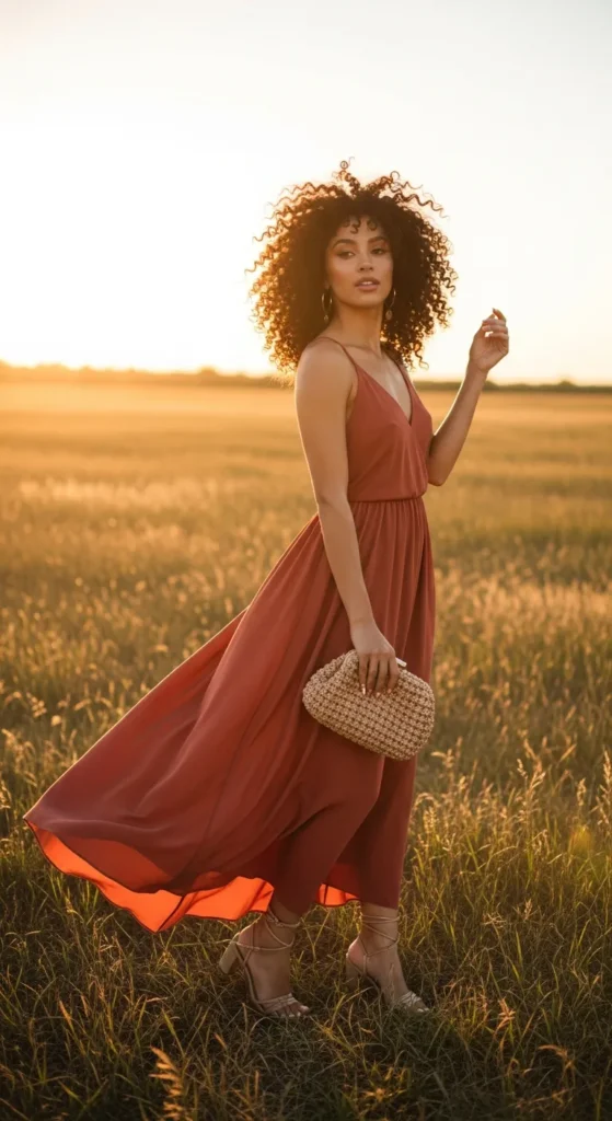 A flowing maxi dress in terracotta or olive brings natural warmth to minimalist dressing. Its simplicity allows movement and fabric to stand out, creating quiet elegance for both day and evening.