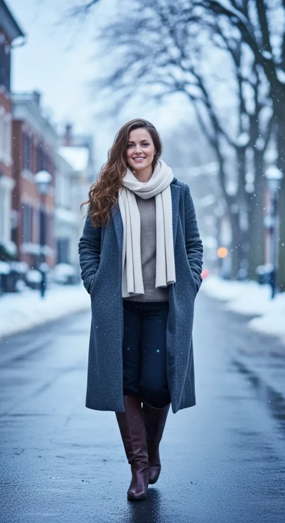 A long wool coat layered over a neutral sweater and straight pants creates warmth without bulk. The clean lines and muted tones make winter dressing feel calm rather than heavy.