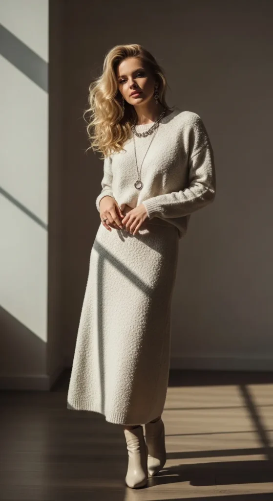 A matching knit top and midi skirt in soft grey or cream creates a cozy yet elevated vibe. The texture adds depth while the monochrome palette keeps everything visually calm and cohesive.
