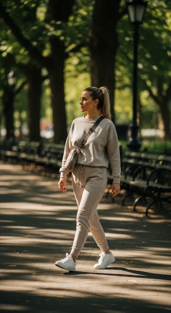 A matching neutral-toned set styled with clean white sneakers offers a relaxed yet cohesive aesthetic. It feels modern, easy, and perfect for everyday minimal dressing.