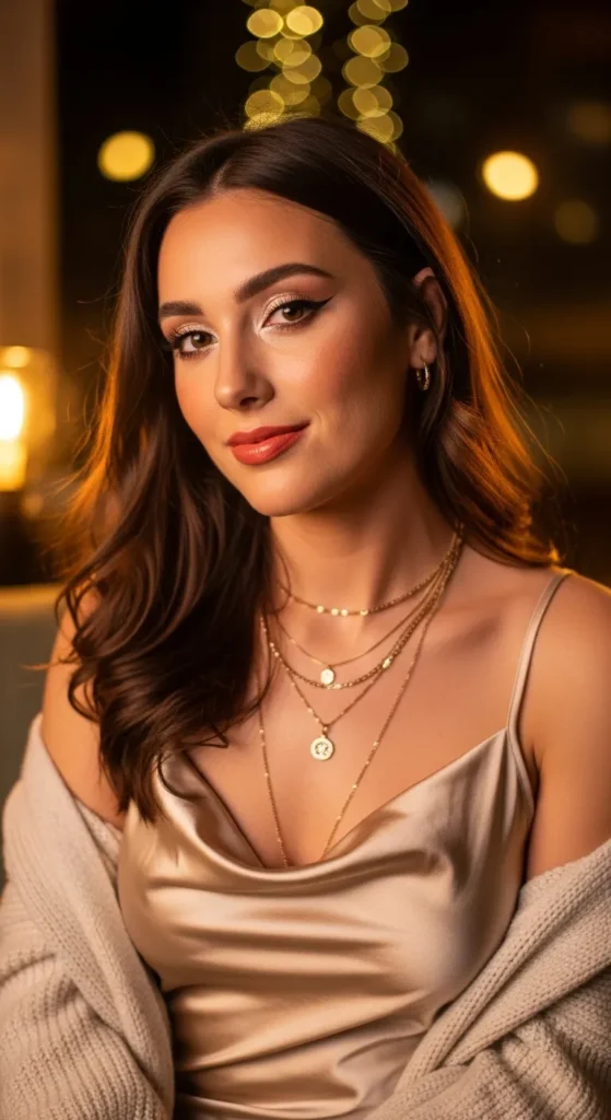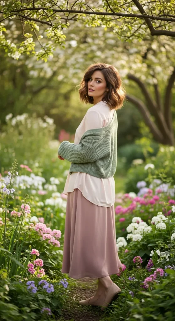 A soft satin slip dress layered with a lightweight cardigan blends elegance with comfort. The gentle sheen of satin contrasts beautifully with the cozy knit.