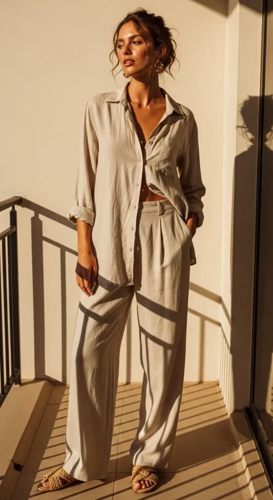 A relaxed linen co-ord in warm beige feels like a slow morning captured in fabric. The breathable texture keeps it light, while the loose silhouette flows naturally, creating a calm, effortless presence in summer heat.
