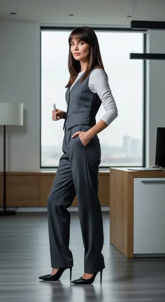 A tailored vest paired with matching trousers creates a clean, modern silhouette. The structured lines feel powerful yet understated, perfect for a refined minimalist look.