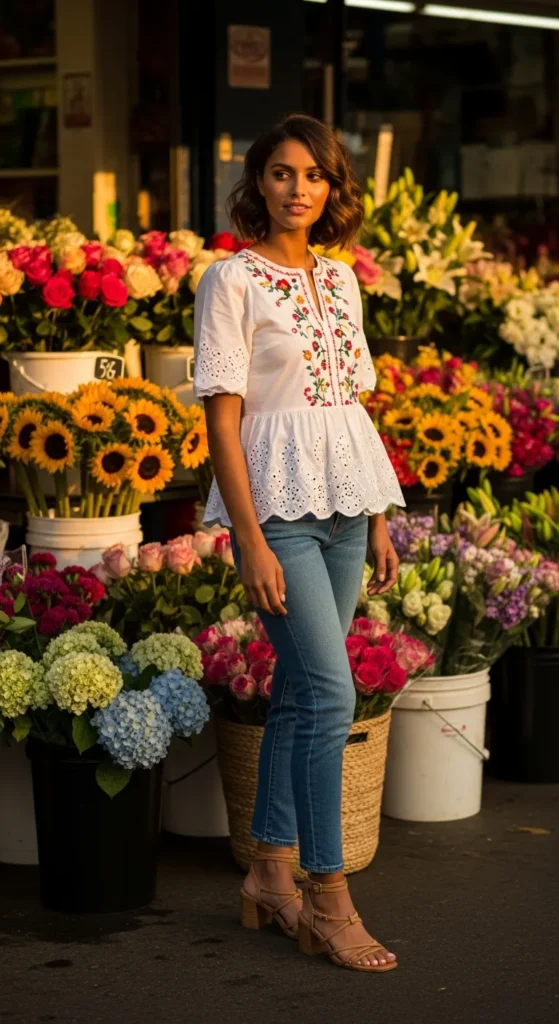 An embroidered cotton peplum top brings movement and charm. The gentle flare at the waist flatters naturally, while subtle stitching details add personality without overwhelming the outfit.