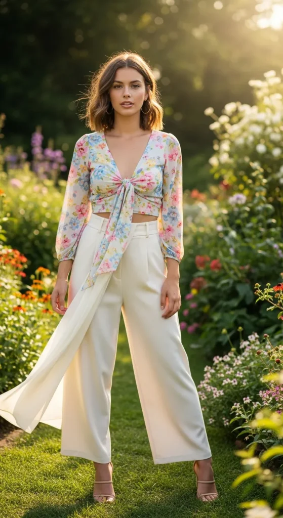 A delicate floral tie-front crop top in soft chiffon instantly feels flirty and playful. Styled with high-waisted wide-leg trousers or a flowy skirt, it brings balanced proportions and that light, happy energy summer days call for.