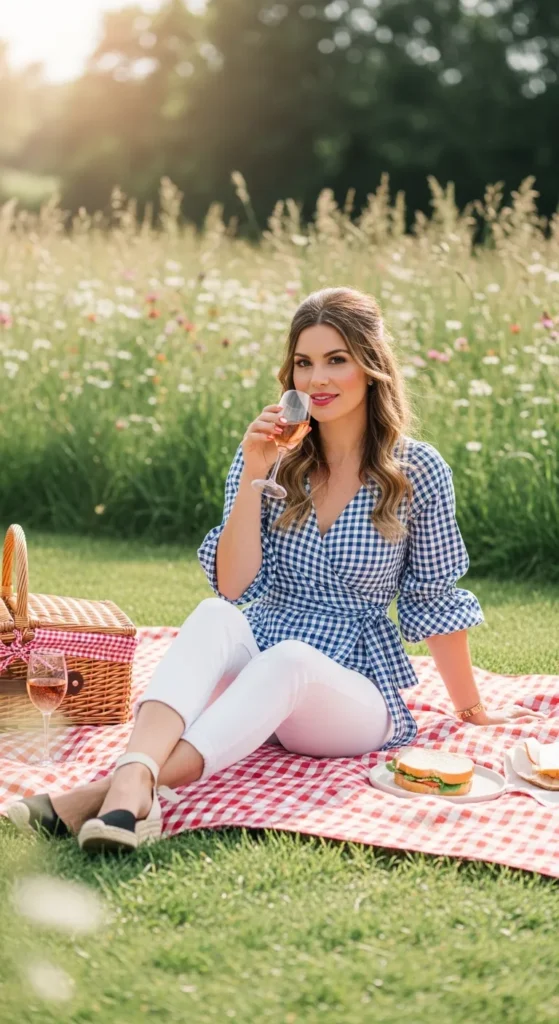A gingham wrap top feels sweet yet structured. The wrap silhouette defines the waist while the classic print keeps it playful and fresh for daytime outings.