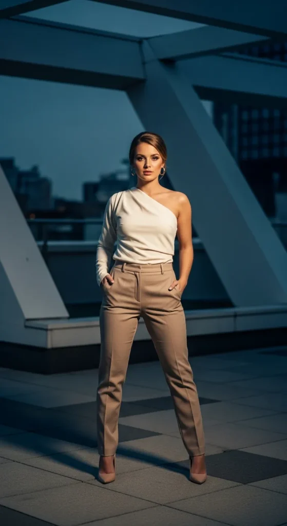 A minimalist asymmetrical top offers subtle edge while remaining wearable. The unique neckline adds visual interest without overwhelming, making it perfect for both daytime styling and evening transitions.