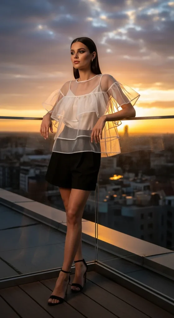 A sheer organza top layered over a simple bralette or camisole creates dimension without feeling overdone. The subtle transparency and airy fabric feel artistic, modern, and perfect for creative summer evenings.