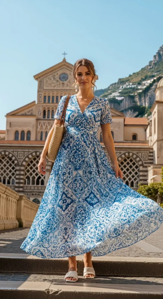A flowy maxi dress inspired by Italian ceramic tiles in blue and white creates instant Amalfi magic. The movement of the skirt against the ocean breeze feels dreamy.