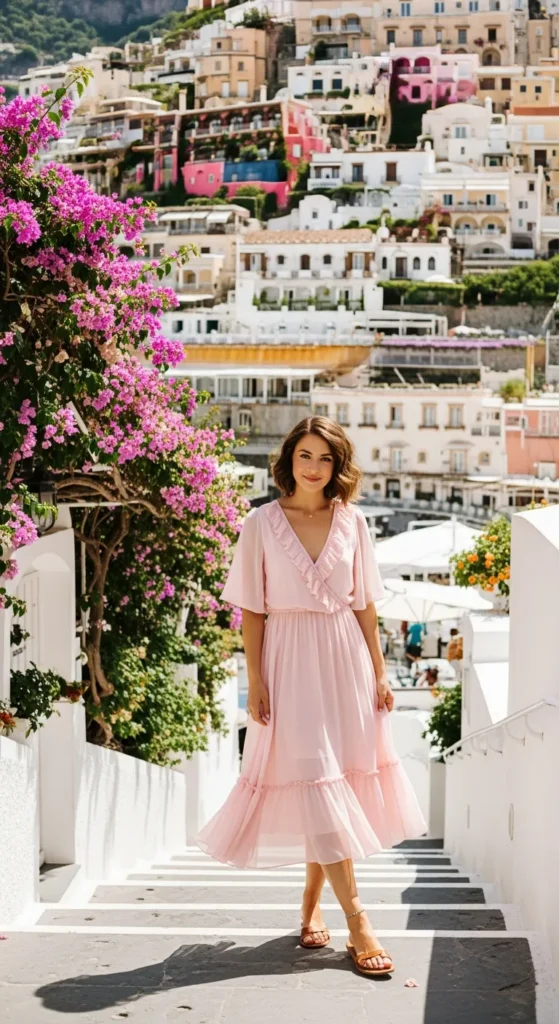 A pastel pink ruffle dress brings softness and romance to seaside strolls. It photographs beautifully against whitewashed buildings.