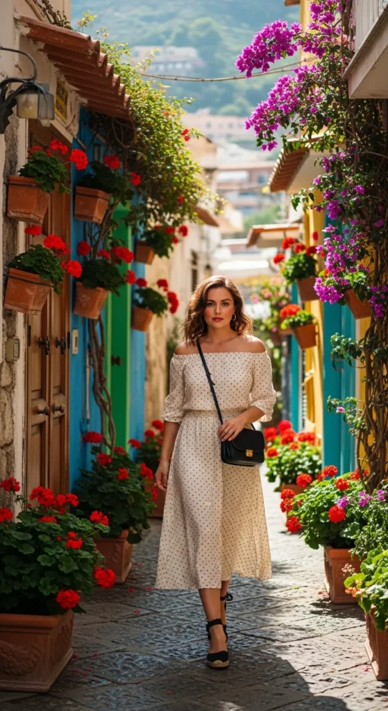 A soft cream off-shoulder dress with tiny black polka dots feels flirty yet classic. It’s playful without being loud, perfect for exploring hidden alleyways.