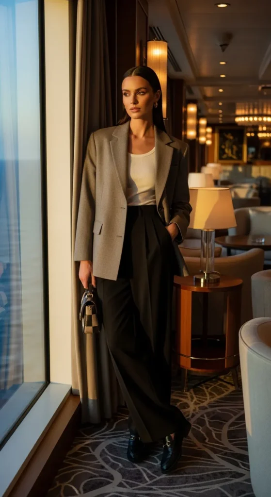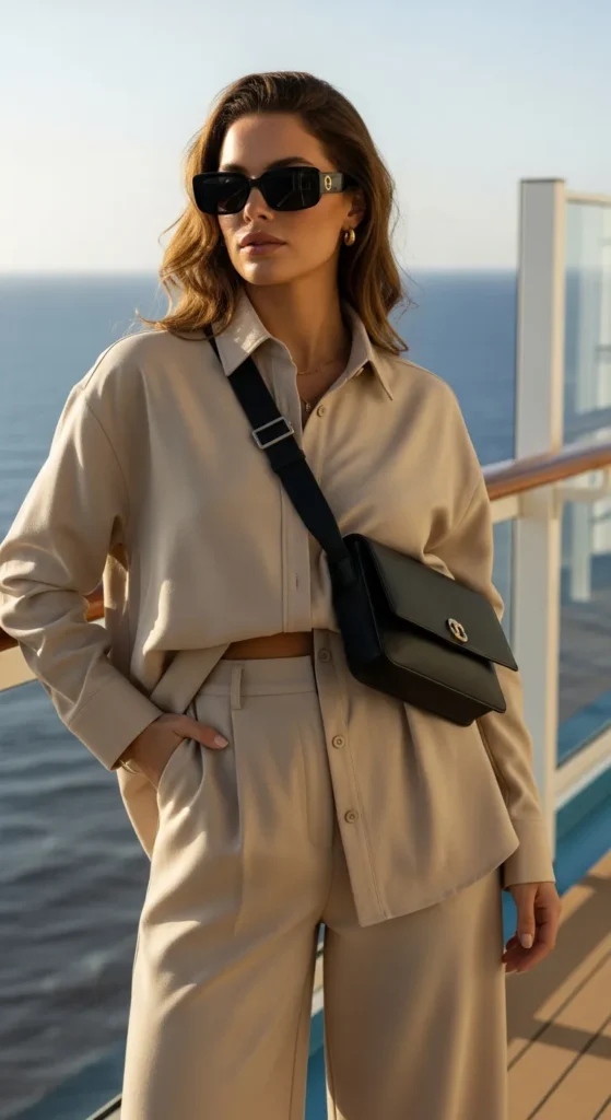 A boxy blazer layered over a simple tank and wide-leg trousers gives a polished yet relaxed silhouette. It’s powerful without trying too hard, perfect for evening strolls or casual onboard dinners.
