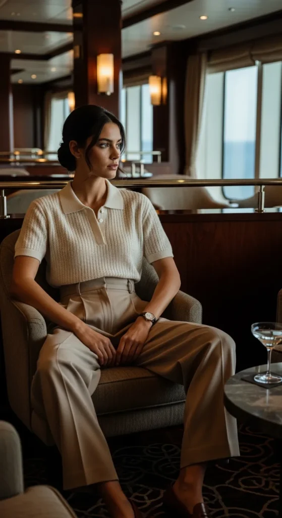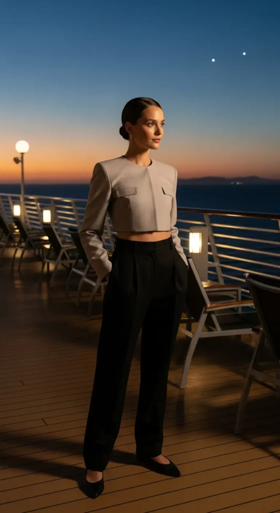 A cropped sweater paired with wide pants creates a balanced silhouette that feels both cozy and sharp. It’s ideal for slightly cooler cruise evenings.