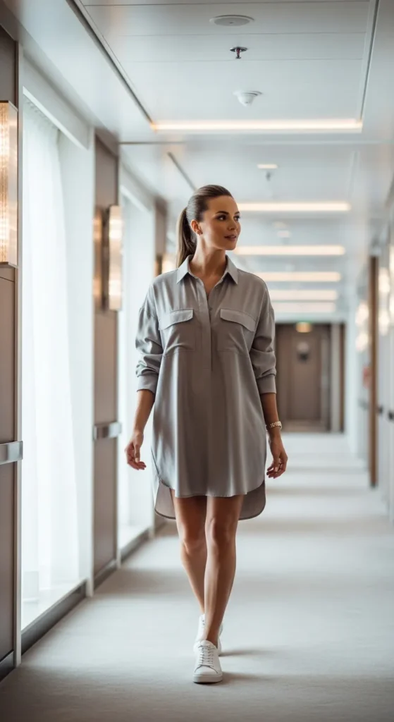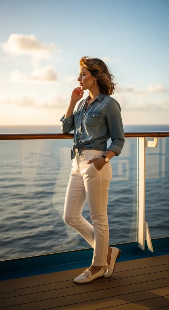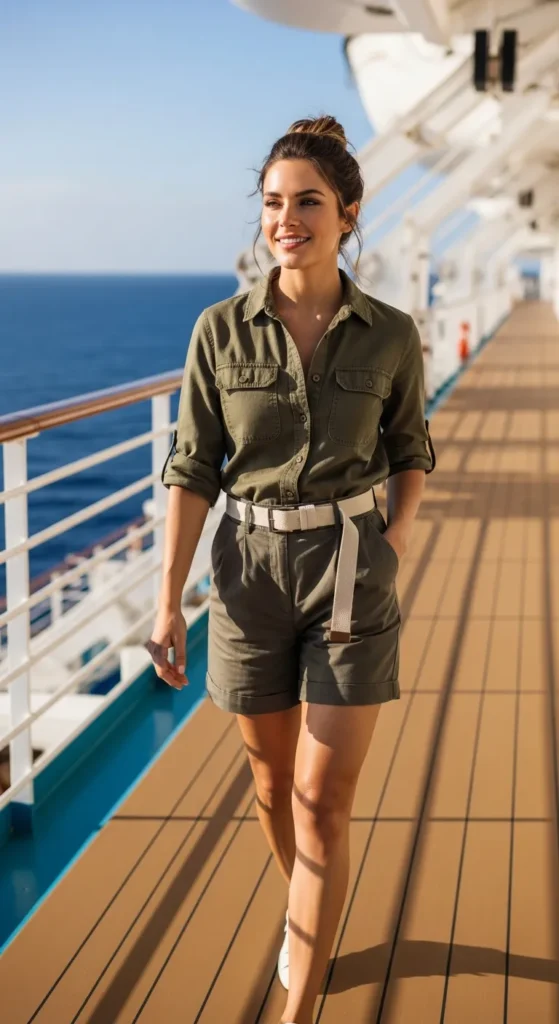 Stylist Suggestion: Add a canvas belt and sneakers. These elements reinforce the utility vibe while keeping the look comfortable for long cruise days.