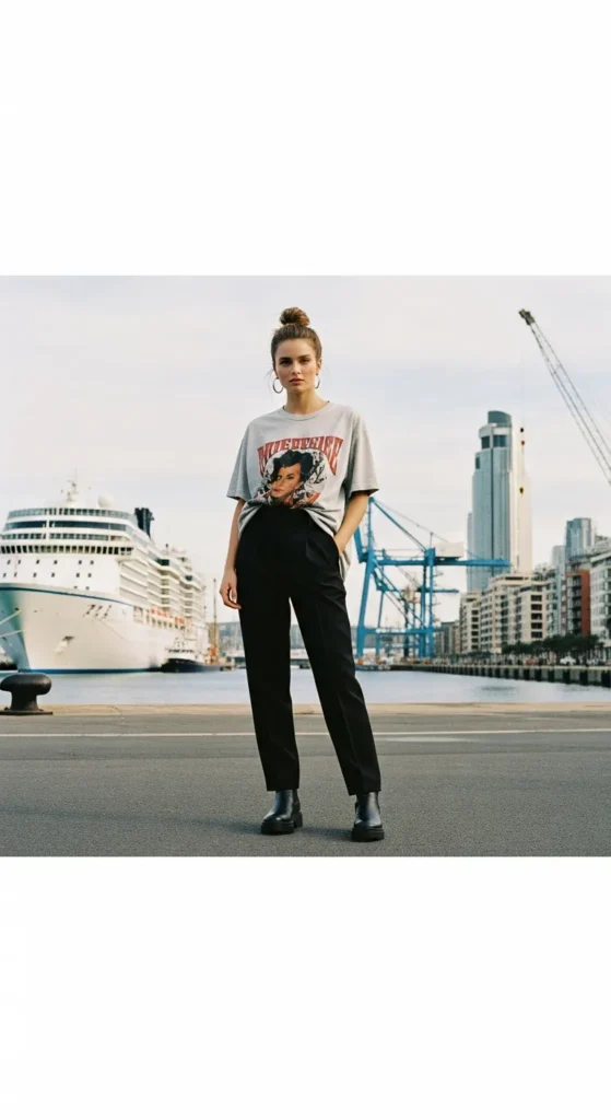 A loose graphic tee tucked into tailored pants blends casual energy with polished structure. It feels playful yet grounded, perfect for daytime exploring stops.
