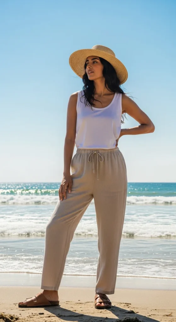 A minimal tank tucked into linen trousers feels effortless and breathable. The simplicity makes it versatile while still maintaining a refined cruise aesthetic.