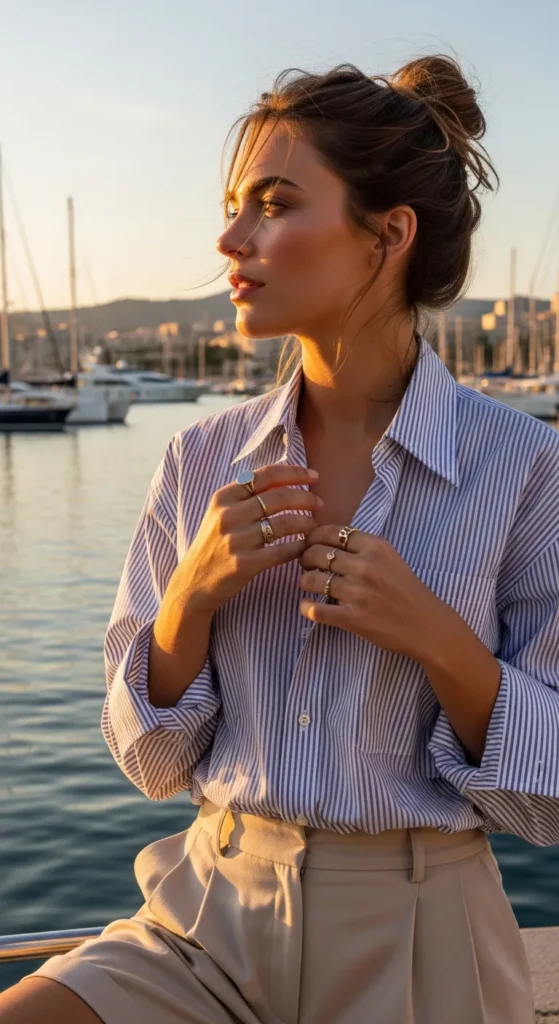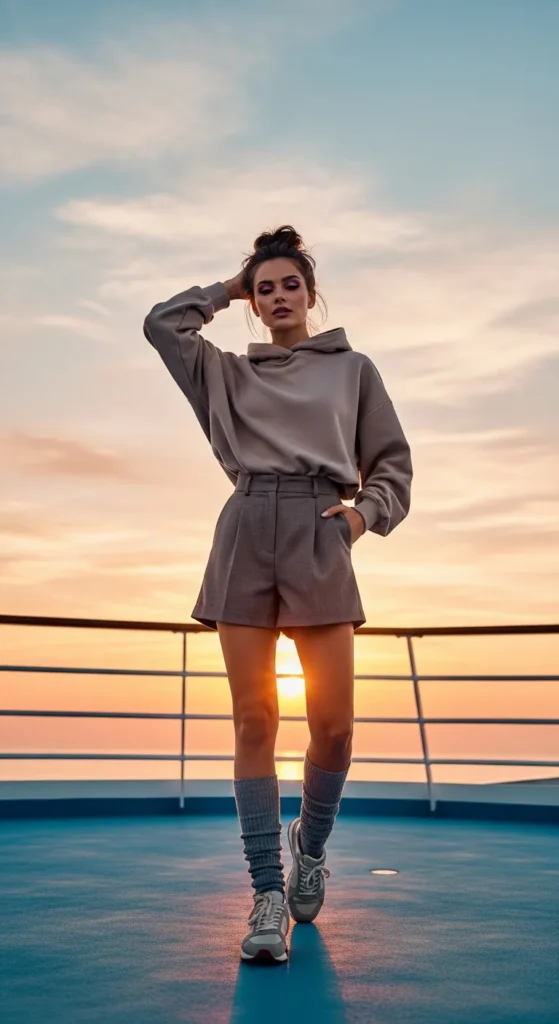 An oversized hoodie styled with tailored shorts creates a cool contrast between cozy and structured. It’s perfect for breezy evenings or early morning coffee runs on deck.