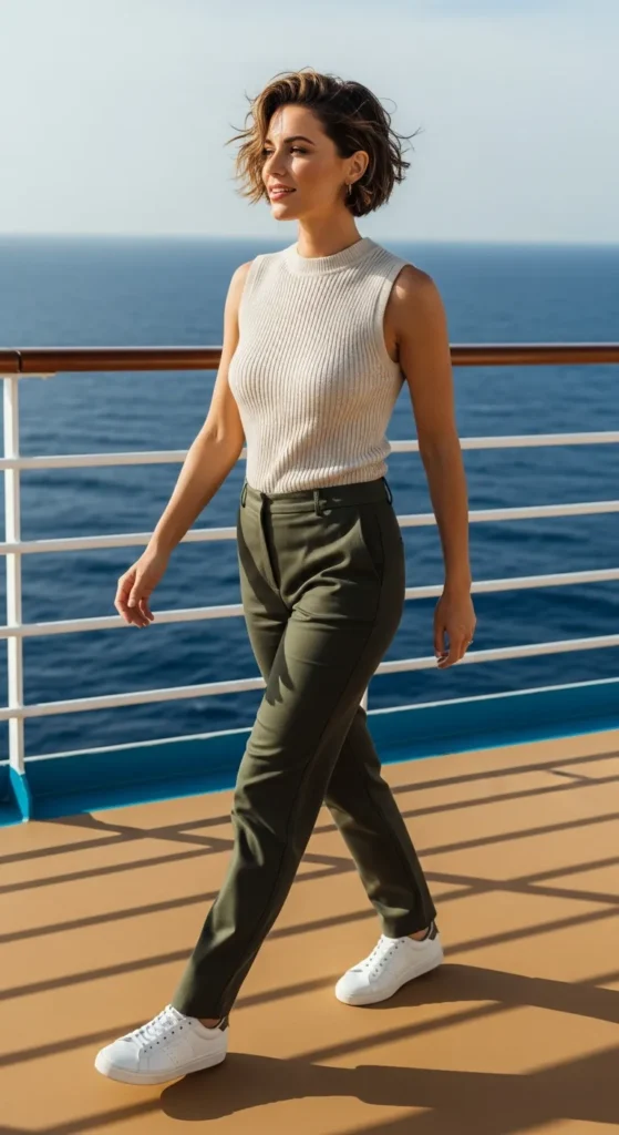 A sleeveless knit top paired with straight-leg pants feels clean, modern, and quietly confident. The fitted top balances the relaxed bottom, creating a streamlined and comfortable cruise look.