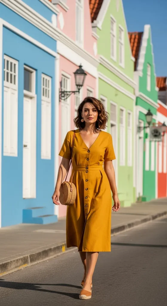 Mustard shades pop beautifully against Aruba’s pastel buildings. A button-front midi dress feels classic yet playful, especially when paired with minimal accessories.