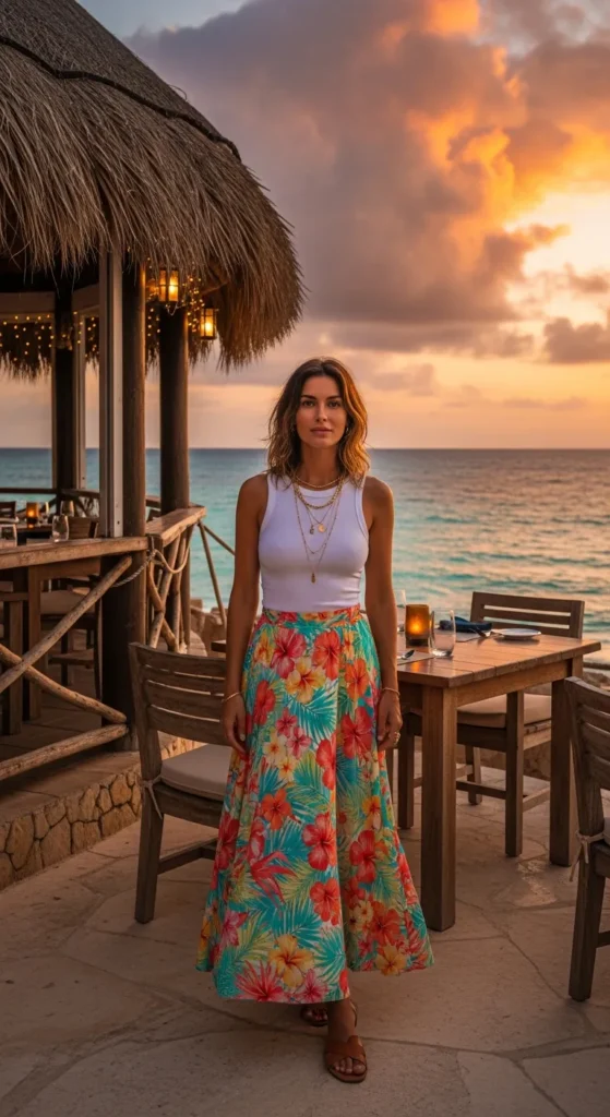 A lightweight printed maxi skirt with a simple fitted white tank creates an easy, feminine silhouette. It feels breezy enough for the heat but still put-together for dinner near the water.