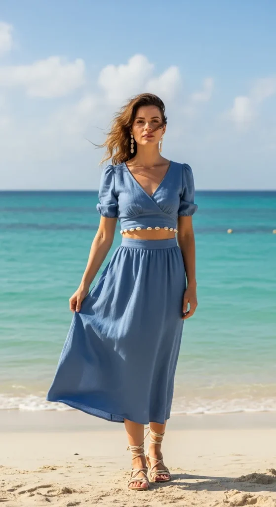 A breathable linen crop top and matching high-waisted skirt in powder blue feels polished yet relaxed. The monochrome look photographs beautifully against Aruba’s vivid backdrops.