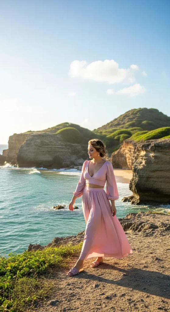 A pastel crop top and matching skirt set feels playful and photogenic. The coordinated tones make styling effortless while standing out against Aruba’s bright landscapes.