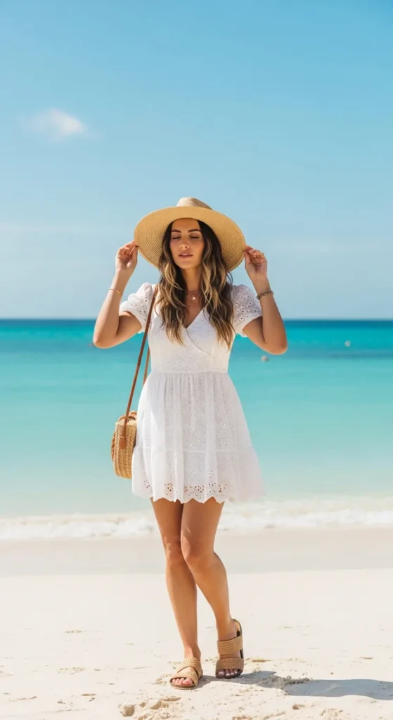 A white eyelet mini dress feels sweet, breathable, and undeniably vacation-ready. The delicate texture keeps it visually interesting without extra layers.