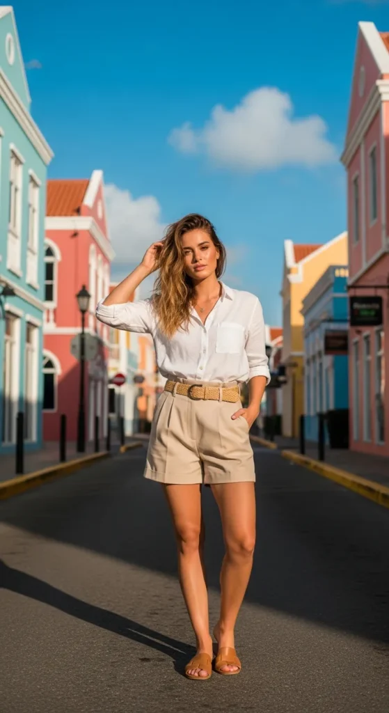 A crisp white linen button-down tucked into tailored high-waisted shorts feels clean, fresh, and effortlessly confident. It’s that timeless vacation outfit that works from breakfast cafés to sunset strolls along the marina.