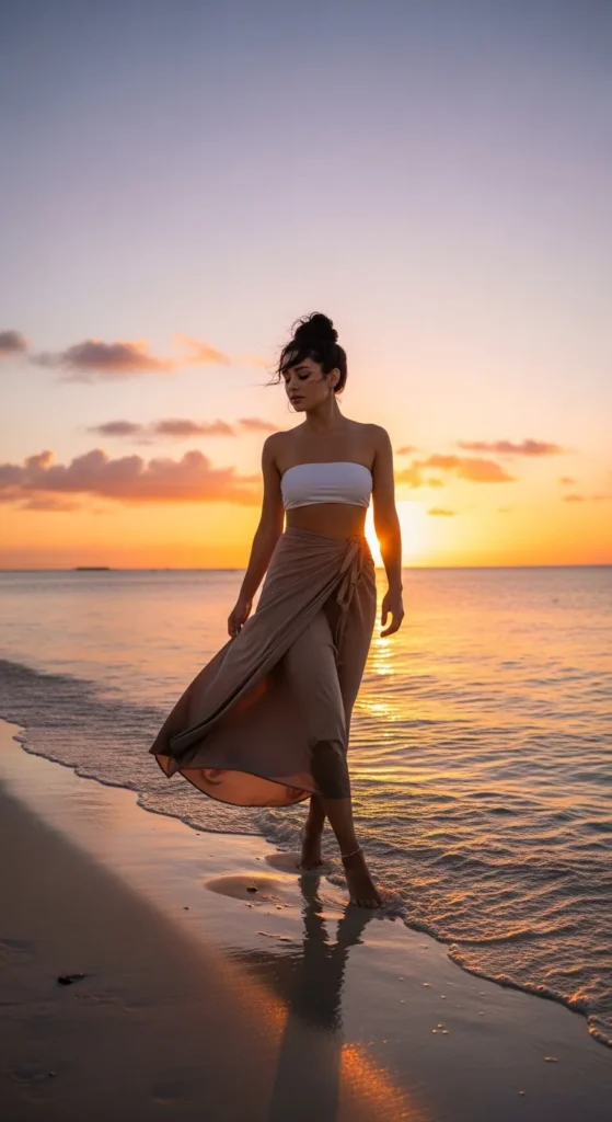 A silky slip dress in champagne or soft rose glows beautifully during golden hour. It’s minimal but feels romantic and slightly elevated for dinner by the sea.