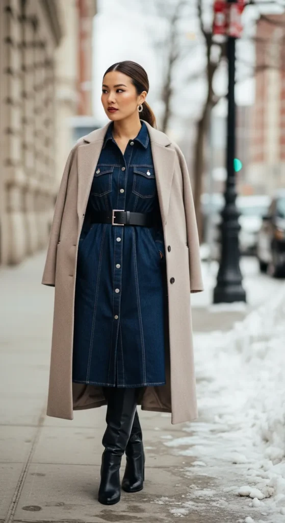 A belted denim dress instantly shapes the body while a long neutral coat adds warmth and movement. This outfit feels confident and clean, ideal for winter walks when you want comfort without losing style.